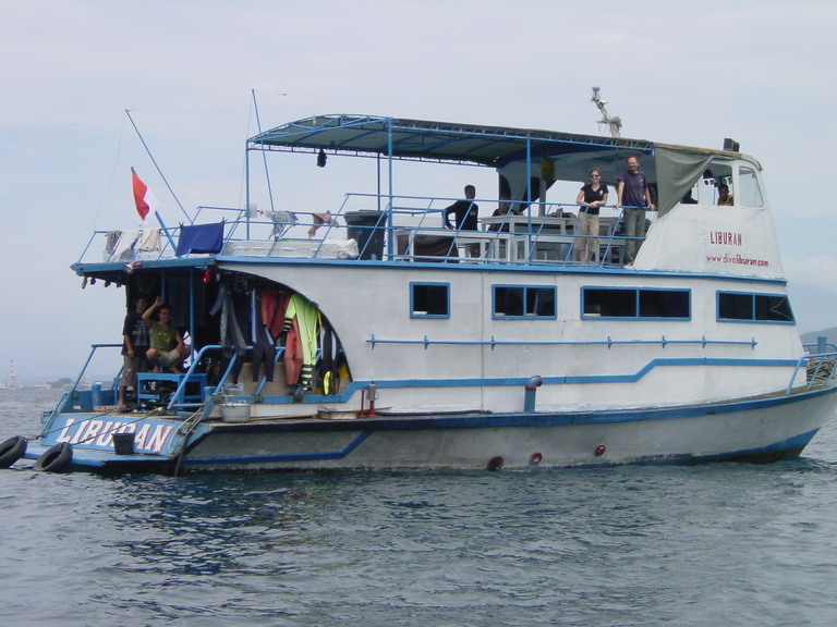 As soon as we arrived in Manado, we started looking for liveaboards. We hoped to find a boat that needed two extra divers for a trip. After trying a few addresses with no luck, we managed to contact Rudi, who runs a boat called the Liburan. Before going straight to the liveaboard, Rudi advised us to dive a few days in Bunaken. Later we ran into Dan, who decided to accompany us to Bunaken and to the Liburan.